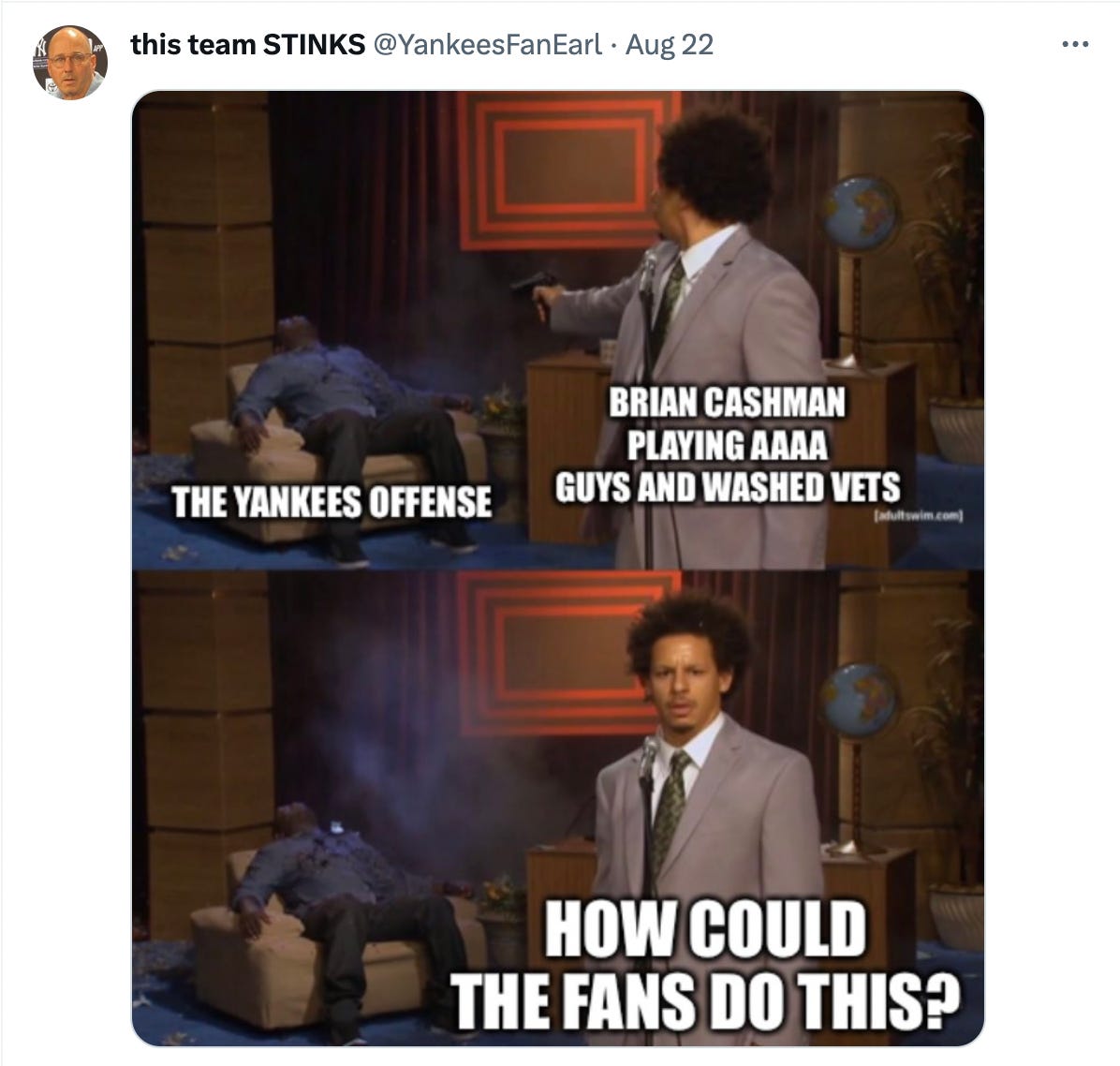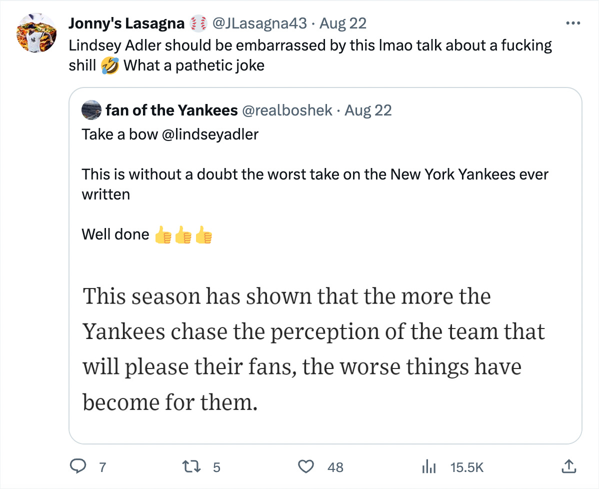 Last month, Lindsey Adler wrote an article for The Wall Street Journal that sent Yankeeland into a tizzy, ostensibly arguing that the Yankees’ recent failures are the result of the front office kowtowing to the fanbase’s whims. I say ostensibly because I’m not a WSJ subscriber and didn’t read it. But let’s be real— having strong reactions to articles you didn’t actually read is the bedrock of social media discourse. And it’s not like any of these dudes read the article, so I’m just playing down to the competition here.
