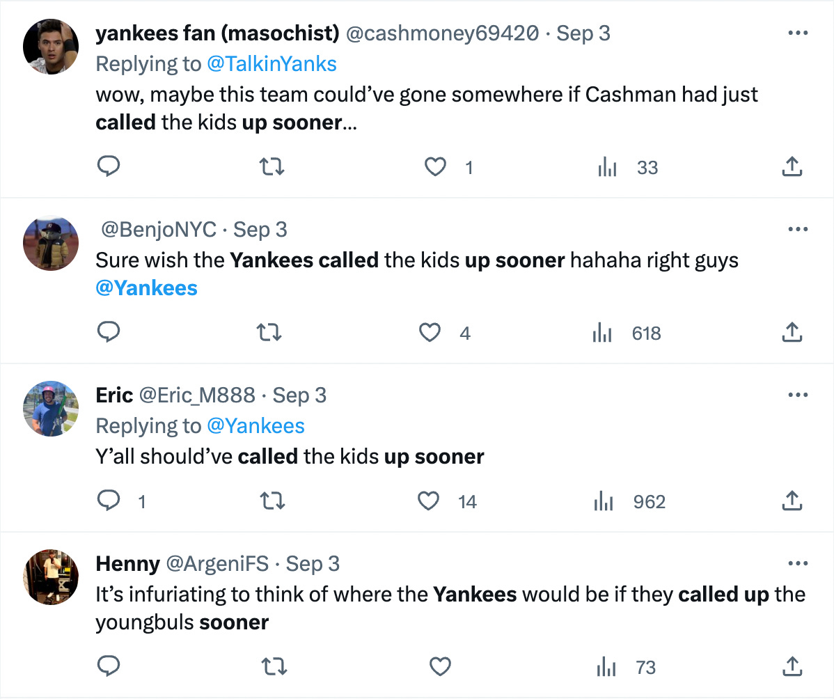 Ah well. Maybe the most crushing of all the blows this year was the news yesterday that Domínguez tore his UCL and will likely be out until sometime next summer. But it puts the Yankees in an interesting spot— how do you sell the fans on 2024 now? The Martian was the de facto face of the team’s budding youth movement, arguably surpassing Volpe in his brief stint in the bigs. Will the promise of Peraza, Pereira and Wells be enough to keep Yankeeland willing to shell out $24.99/mo for a buggy YES app, and like, $18 on a Stadium beer? Or will Hal be forced to crack open the piggybank, possibly for a certain left-handed slugger who can play center field and first base, who’s in his prime and even alluded to a personal affinity for the pinstripes? How the young guys fare in the final 19 games of the season might help determine all that. But Hal should remember one thing: he is dealing with some sick, sick, people.